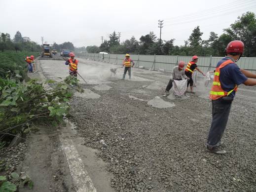 2014年6月,我公司冷再生機首次進入四川施工。先進入四川的是一臺600馬力WR2300L冷再生機,由河南隆裕工程公司于2011年向我公司購買,已工作了近四年,機器狀態(tài)仍然很好。冷再生工程為郫縣唐太路道路改造工程,主要路基的大修采用冷再生工藝。唐太路為水穩(wěn)路基結(jié)構(gòu),與華東等大部分地區(qū)不同的是路基下有大量的鵝卵石,這會對銑刨轉(zhuǎn)子造成很大的磨損,如果機器不是裝備了可折卸刀庫重型轉(zhuǎn)子,這個工程是不可能做下去的,刀具的損耗很大,齒套也有較大的磨損。施工隊伍在高經(jīng)理的帶領(lǐng)下,無論是施工速度還是施工質(zhì)量均獲得管理方的好評,打消了承包方最初對國產(chǎn)設(shè)備的疑慮。